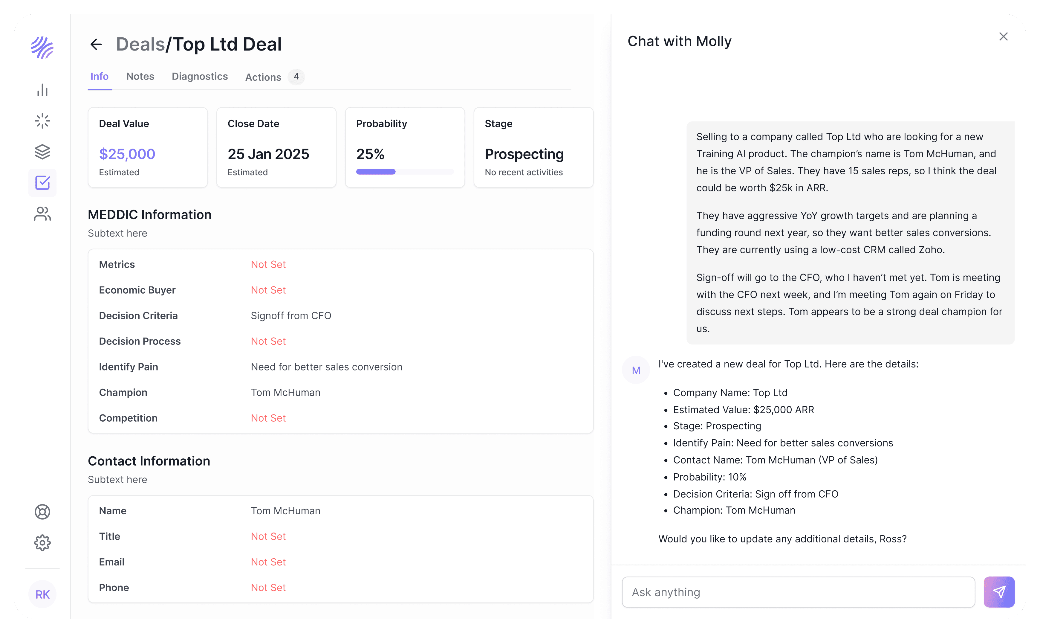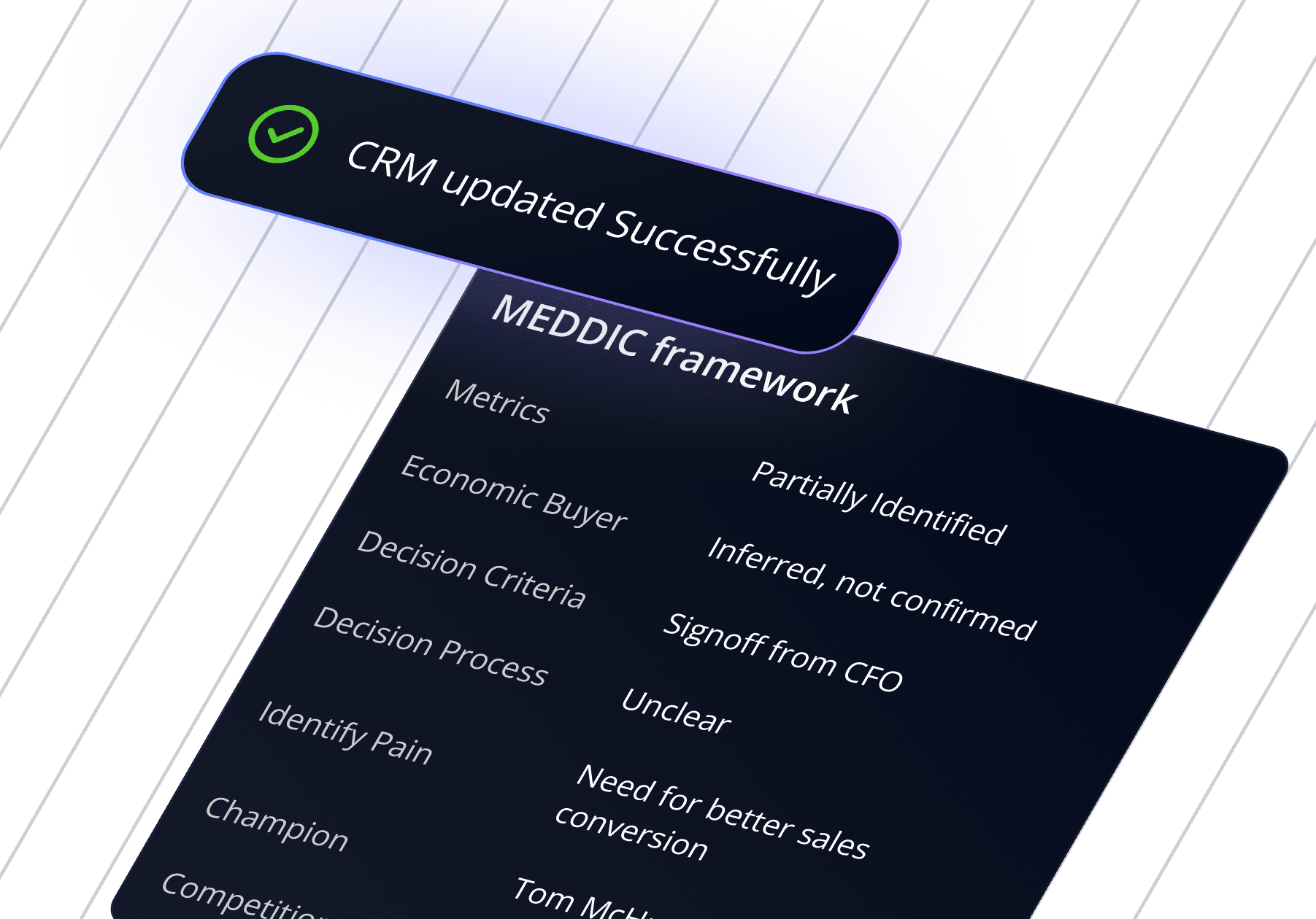 It automatically updates your CRM using the frameworks you already run, creating consistent, reliable deal context without extra admin.