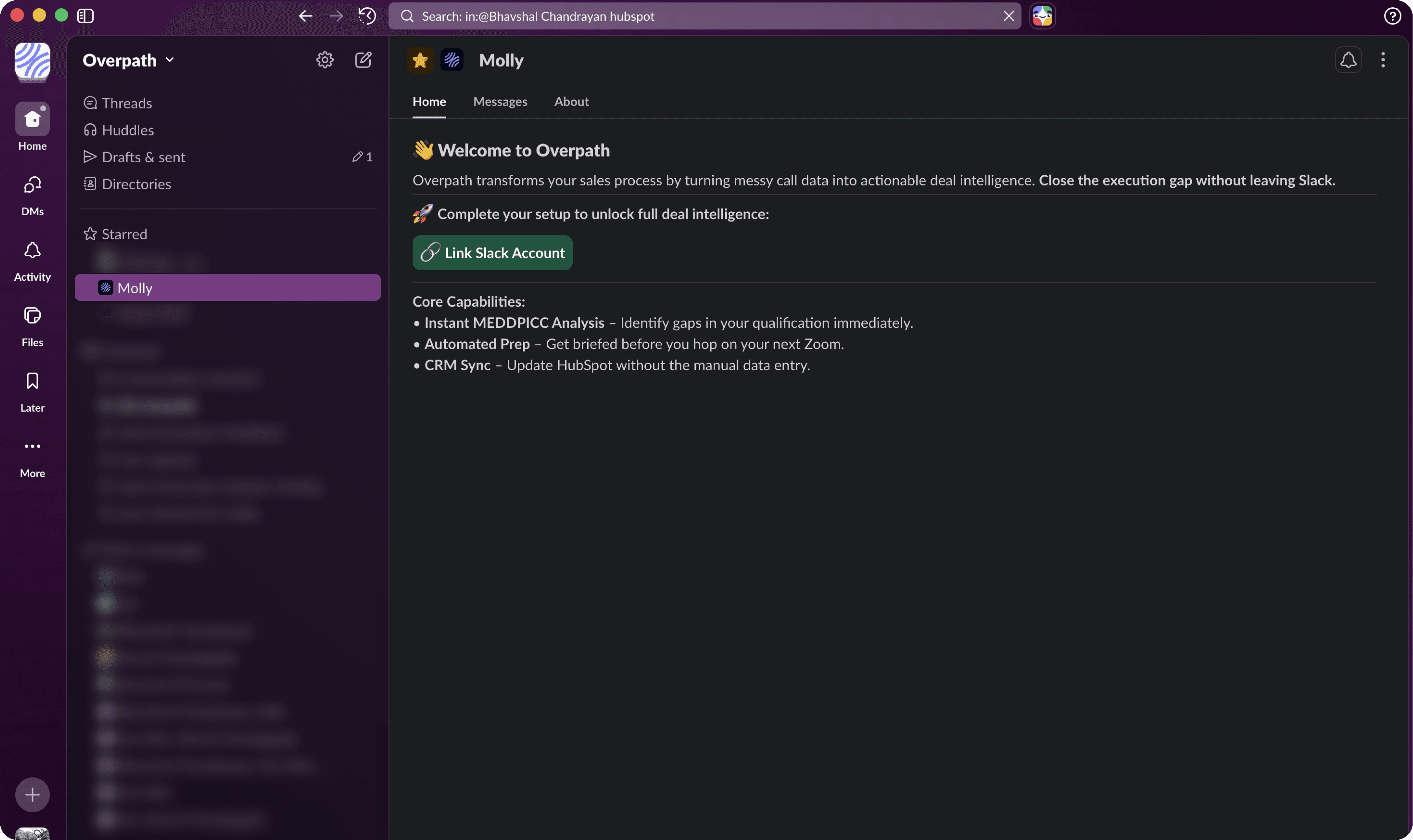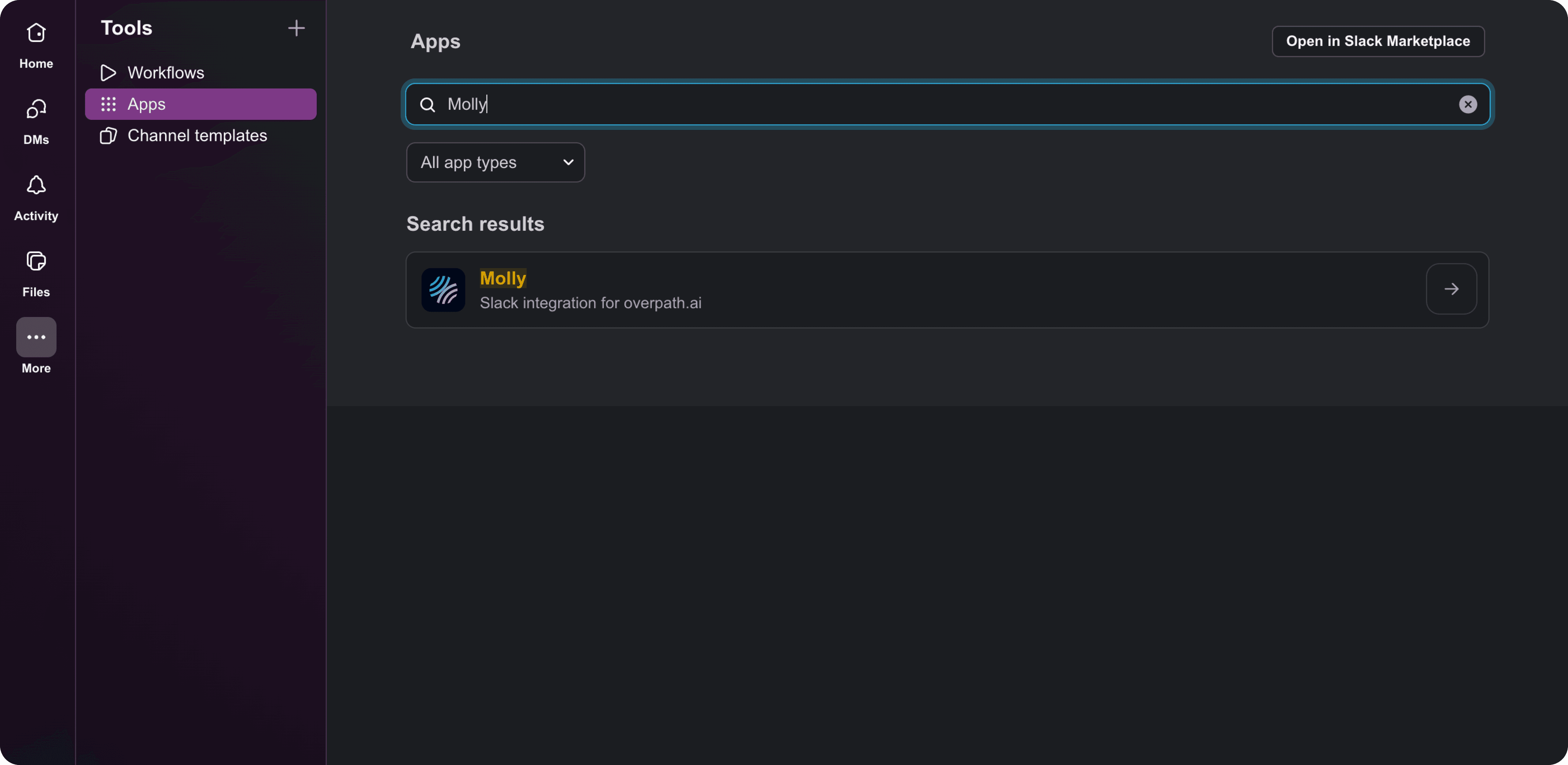 Navigate to Apps and search for Molly (slack integration for overpath.ai)