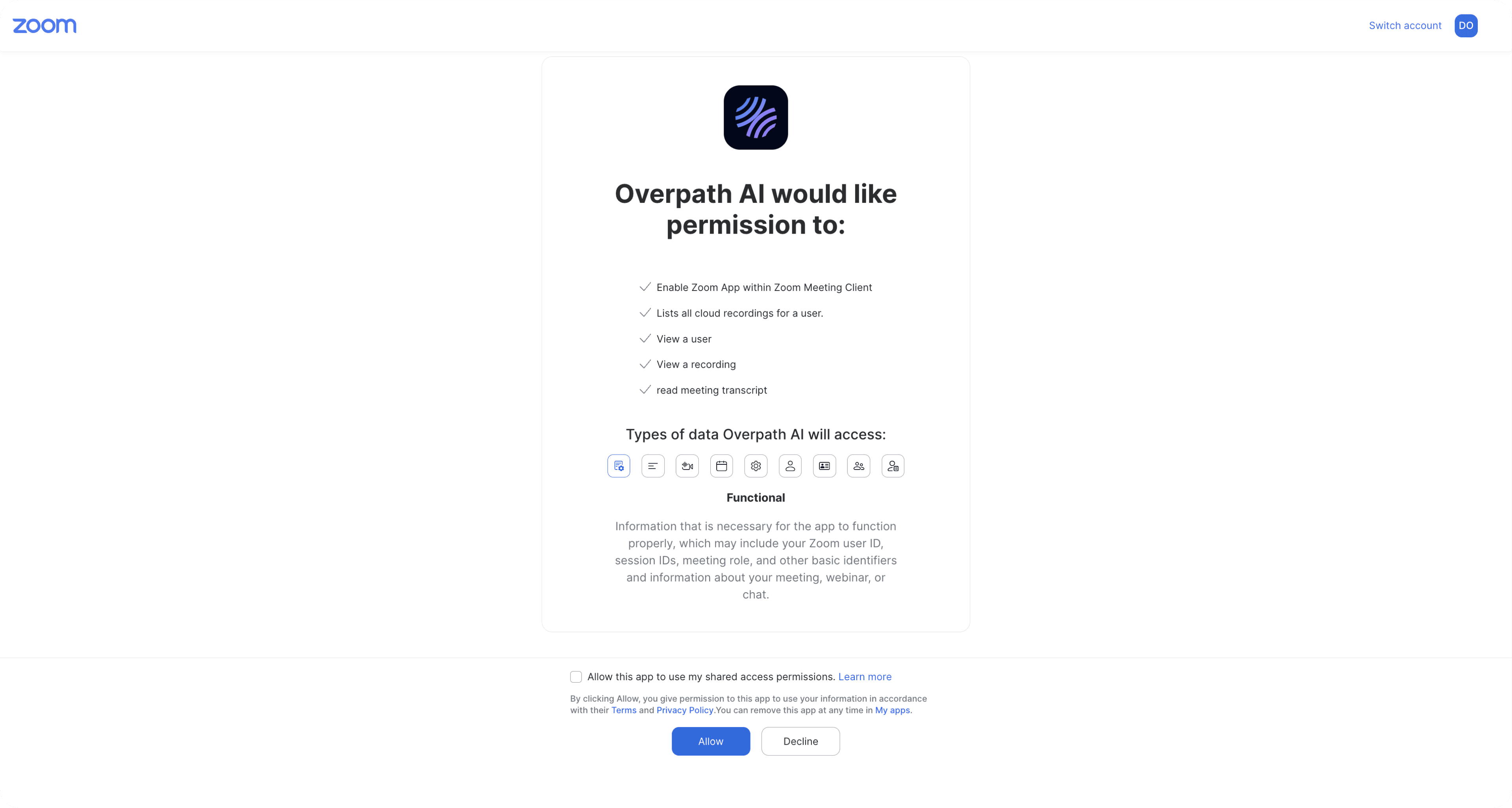 (These are required to access recordings, transcripts, and meeting context)Click Allow to finish connecting Zoom with Overpath AI